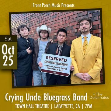 Sat., Oct. 25th, 7-9 PM, at Town Hall Theatre, brought to you by Front Porch Music -- Crying Uncle Bluegrass Band! They are still in college and they are already known around the world as one of the bes of their kind in Bluegrass, Jazzgrass, Dawg music -- it's impossible to give them a fixed category. In 2024, the bluegrass band celebrated their debut at the Grand Ole Opry; and in 2023, they received the International Bluegrass Music Association's Momentum Band of the Year award. The band was also honored to perform for the Bluegrass Music Hall of Fame’s induction of their hero, David Grisman. Not to be missed. Learn more.